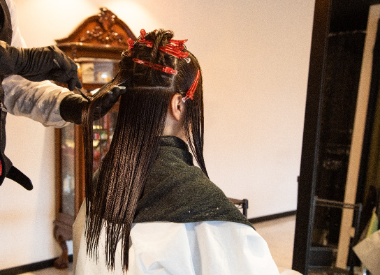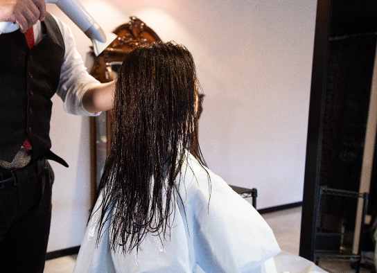 1液で軟化した状態の髪を形作っていきます。特殊なブラシでブローをしていきます。